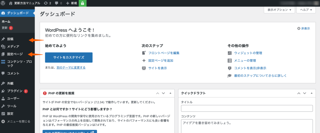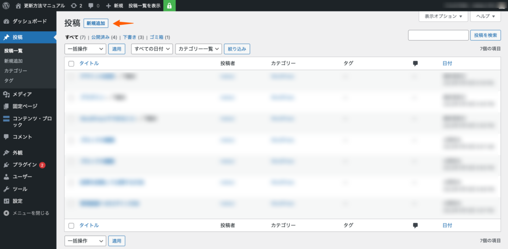 メニューの 投稿をクリックして投稿ページへ移動します。