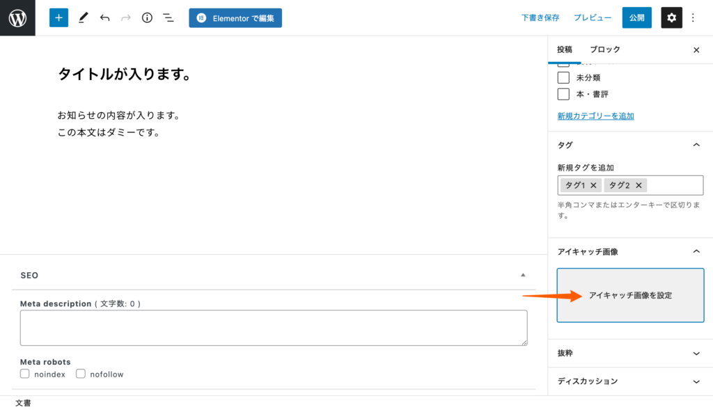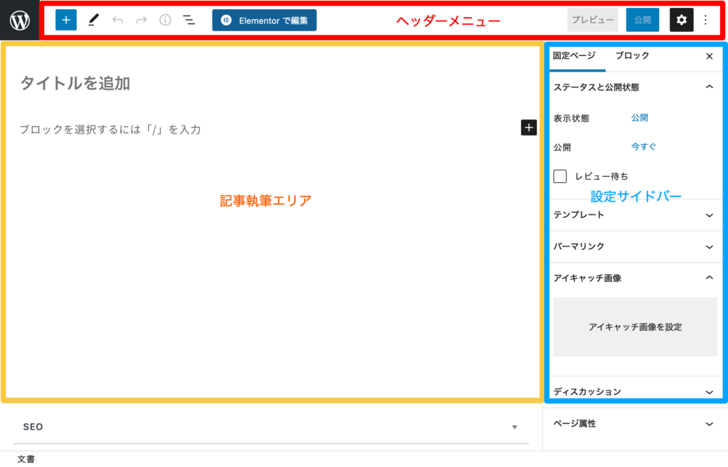 編集画面は、ヘッダーメニュー / 記事執筆エリア / 設定サイドバー の3つのエリアで構成されています。