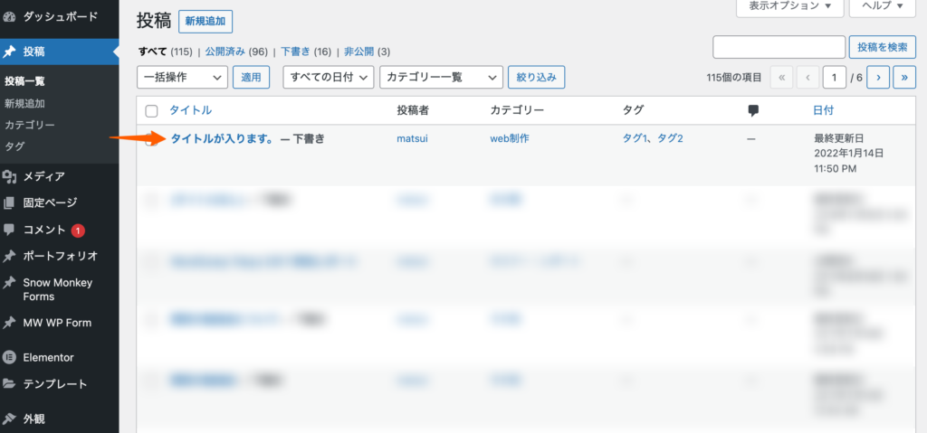 編集を再開したいときは、投稿一覧から記事のタイトルをクリックすることで編集を再開できます。